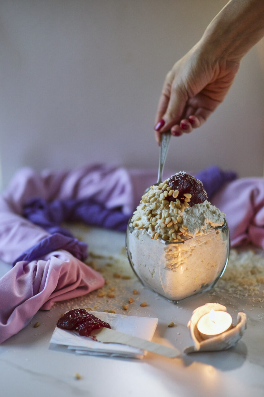 You can also grind roasted sesame seeds together with the biscuits and finish the dessert with desiccated coconut and pine nuts. This is another variation I’ve made before, as shown in the gallery below.