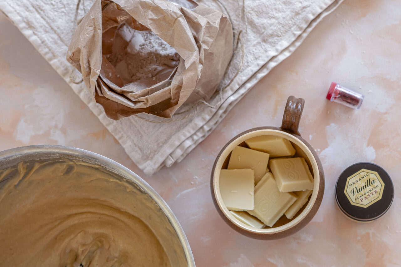 - White chocolate – gives sweetness and helps create a smooth batter