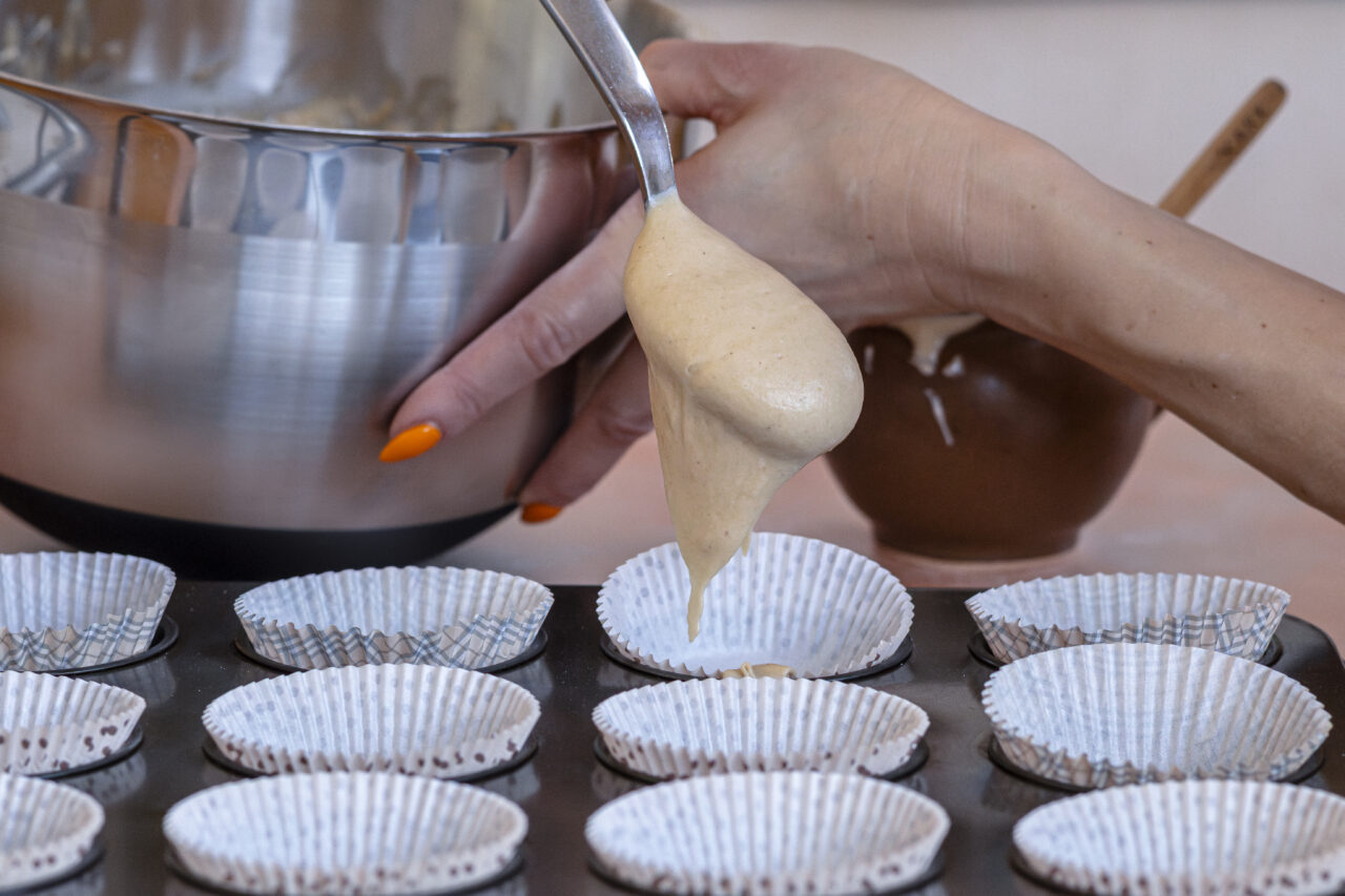 - Fill muffin cups evenly to control rise